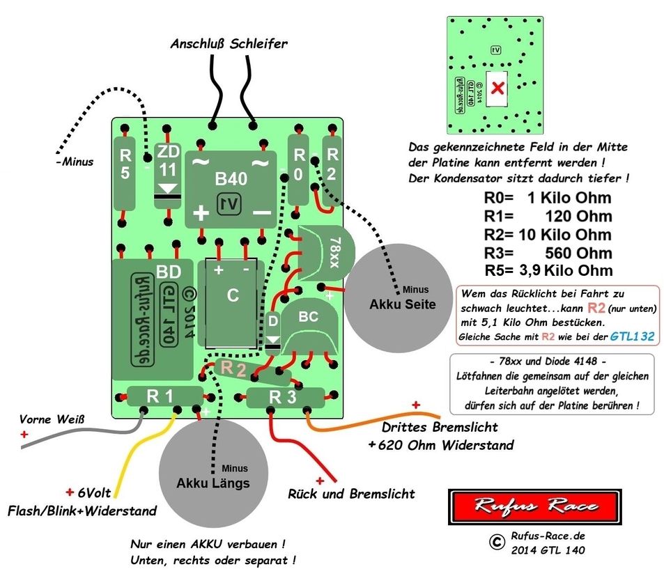 R2 muß dafür von der GTL140 Platine und ans Kabel, wie bei Tagfahrtschaltung GTL140.